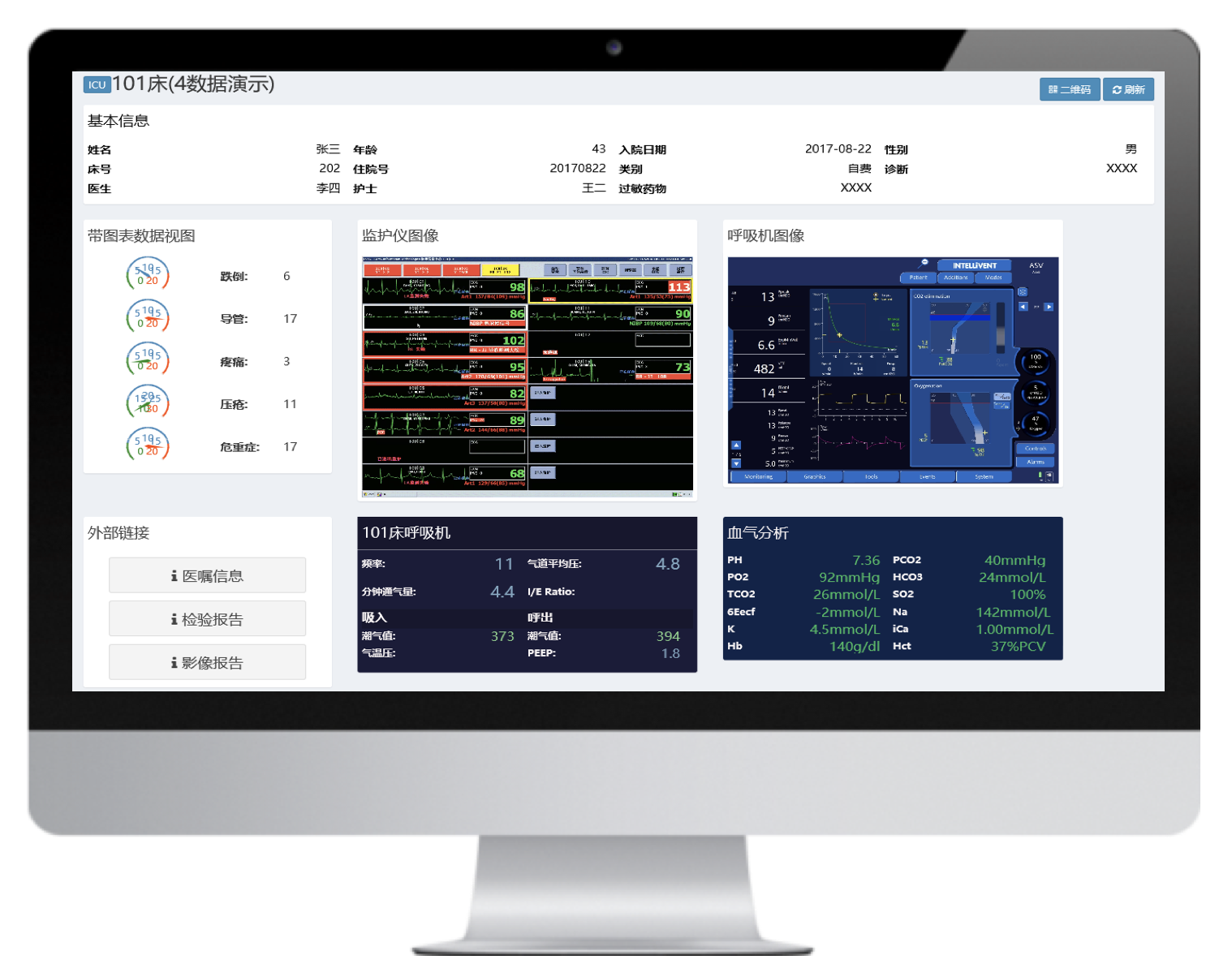 實(shí)時(shí)呈現(xiàn)病人體征參數(shù)、變化趨勢,診療設(shè)備參數(shù),同時(shí)接入醫(yī)囑、檢驗(yàn)結(jié)果數(shù)據(jù),一體化呈現(xiàn)存儲(chǔ)和回溯,方便醫(yī)護(hù)急救、會(huì)診、查房